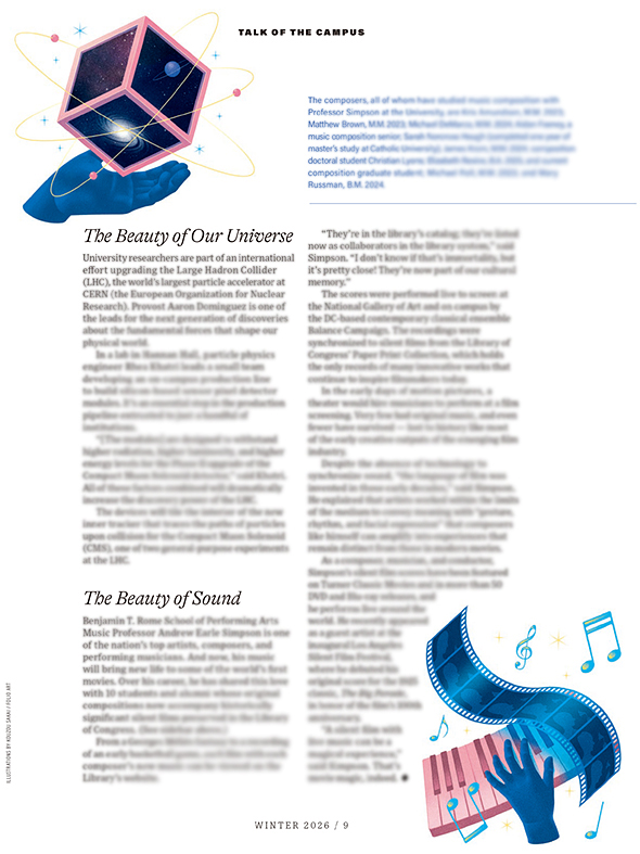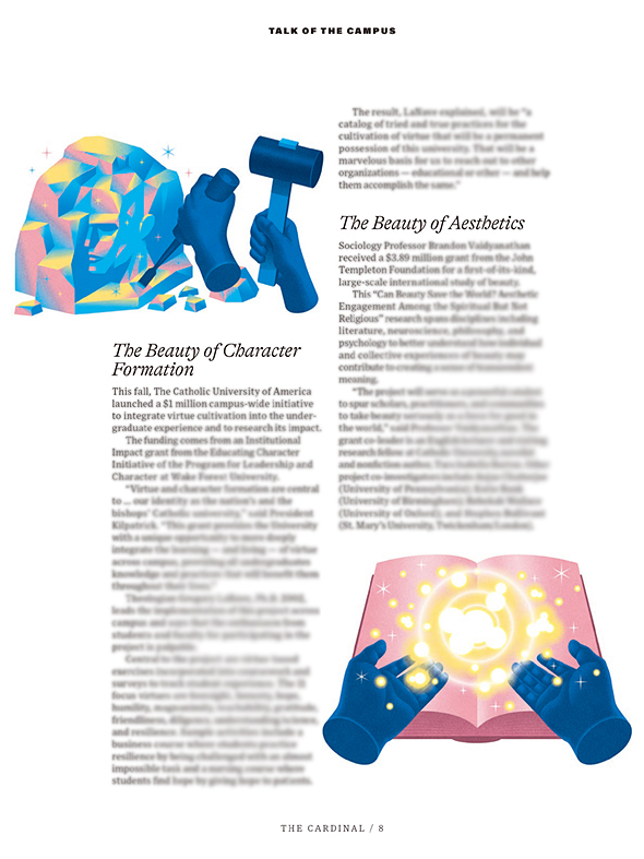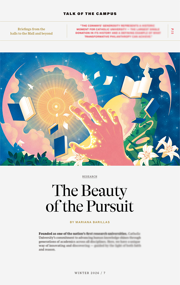 The illustrations are for the article “The Beauty of the Pursuit” on The Cardinal Winter 2026. Founded as one of the nation’s first research universities, Catholic University’s commitment to advancing human Knowledge shines through generations of academics across all disciplines.